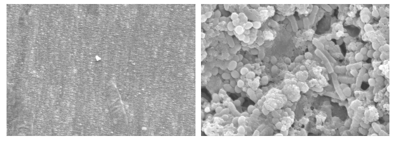 Comparison of 1.4mm PTFE tube (to simulate air/water and auxiliary channels) without biofilm (left) and with biofilm (right). 8000X magnification.