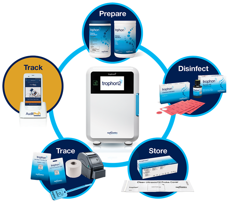Going beyond the high level disinfection (HLD) step, the trophon® portfolio offers a series of consumable and accessory product solutions to allow users to prepare, disinfect, store and trace the reprocessing process.
